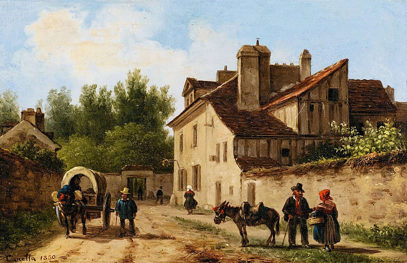 На представленной картине автор запечатлел обширный пейзаж с доминирующим архитектурным ансамблем в перспективе. В переднем плане простирается зелёная равнина, по которой ведёт грунтовая дорога. На дороге и у ее края расположились несколько фигур людей и животных – вероятно, путешественников или сопровождающих процессию. Их одежда указывает на определённый социальный статус и время действия.