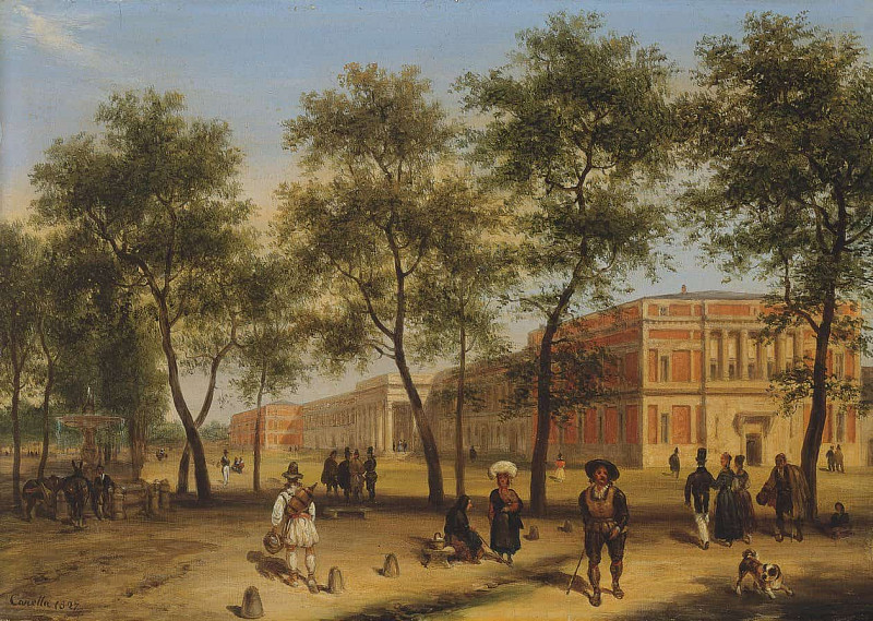 Перед зданием простирается водная гладь, на которой видны небольшие лодки, перемещающиеся по поверхности. Фигуры людей, расположенные вдоль берега и в лодках, придают сцене динамизм и масштабность.