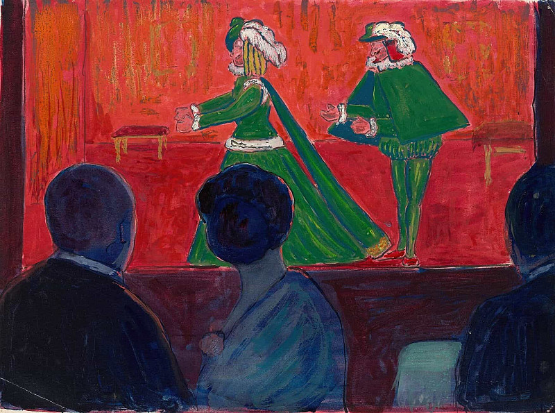 Цветовая палитра картины довольно насыщенная: преобладают тёплые тона – жёлтый, красный, зелёный – которые контрастируют с холодными оттенками синего и серого в заднем плане. Это создаёт ощущение динамики и живописности. Манера письма отличается некоторой экспрессивностью, мазки широкие и энергичные, что придаёт изображению особую выразительность.