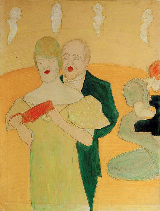 За столом виднеется ещё один человек, также сидящий спиной к зрителю, что создаёт ощущение замкнутости группы и отстранённости от внешнего мира. Фон картины состоит из стилизованного пейзажа: голубое небо, деревья с густой зеленью и тёмные силуэты зданий или растительности по краям.