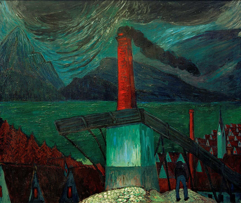 Горы, занимающие большую часть заднего плана, написаны широкими мазками тёмных оттенков зелёного и синего, что придаёт им монументальность и создаёт ощущение величия природы. Небо заполнено динамичными облаками, которые добавляют картине ощущение движения и изменчивости.