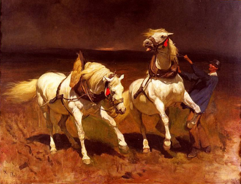 В экипаже находится человек, одетый в простую одежду, его поза говорит о внимательном управлении процессом движения. Он словно наблюдает за дорогой, готовый к любым неожиданностям. Его фигура, расположенная ближе к зрителю, притягивает внимание и создаёт ощущение сопричастности к происходящему.
