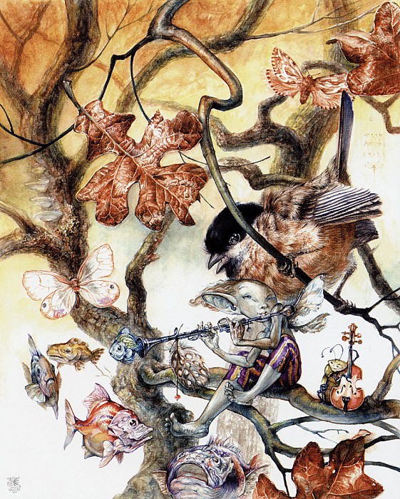 Возможно, это картина с изображением носорога, лежащего на земле, феи на его спине и феи на спине носорога.