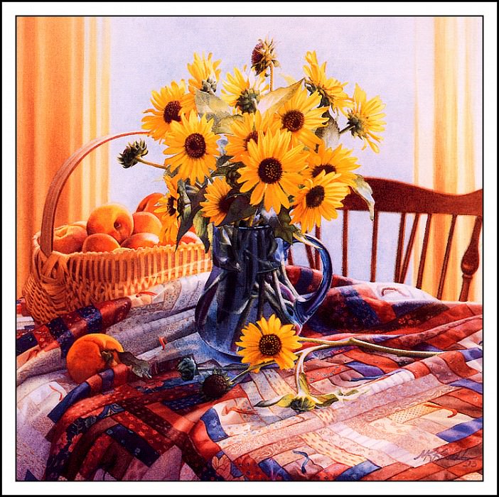 Возможно, это картина с изображением подсолнухов и других цветов в серебряном кувшине на столе с оранжево-белой клетчатой скатертью на скатерти.
