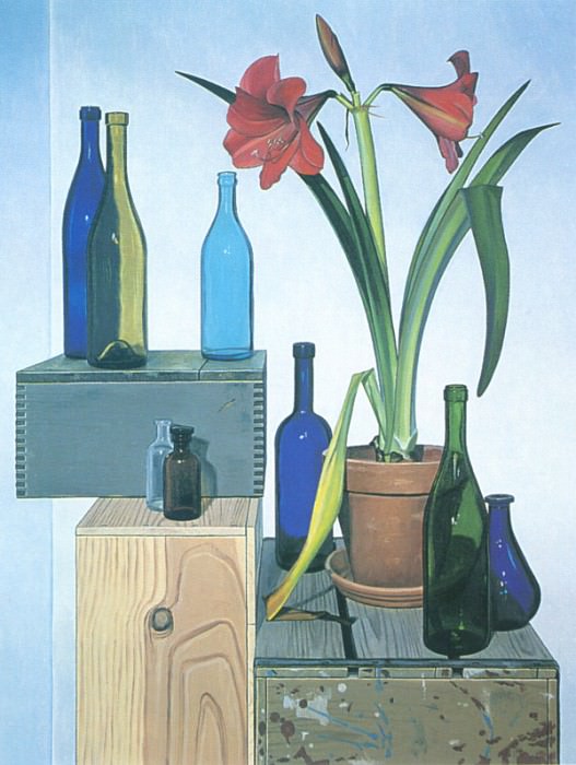 Возможно, это картина с изображением черно-белой собаки, сидящей на стопке книг с вазой подсолнухов и бутылкой вина.