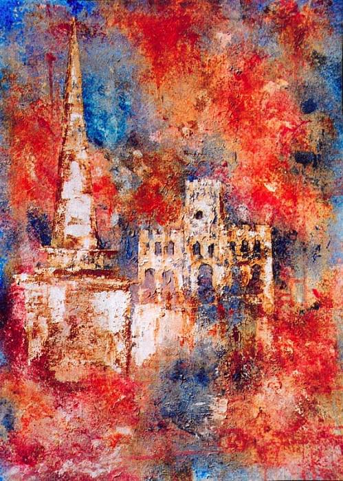 Возможно, это картина с изображением здания с башней с часами в центре картины.