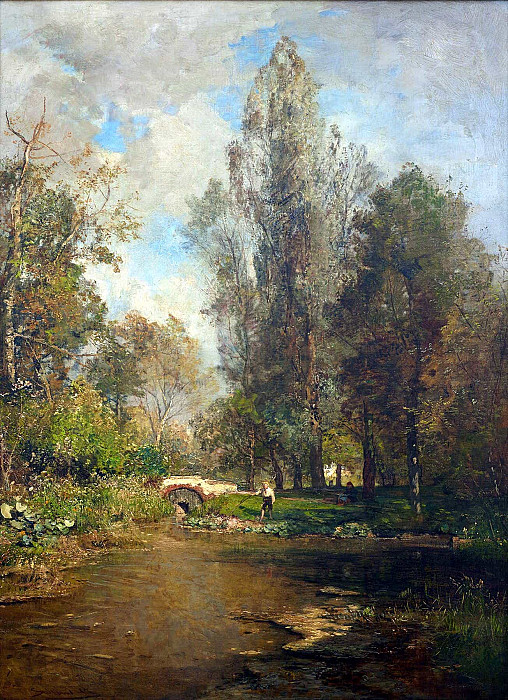 Скалистые берега ручья написаны в тёплых коричневых и охристых тонах, что придаёт им массивность и устойчивость. На заднем плане возвышаются тёмные, густолиственные деревья, создающие эффект глубины и подчёркивающие контраст между светлой водой и тёмной растительностью. Листва написана энергичными мазками, передающими текстуру и объем.
