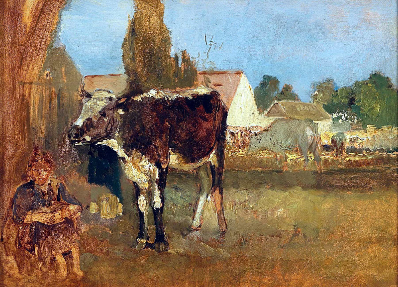 На переднем плане, у самой кромки воды, пасётся корова, добавляющая сцене жизни и спокойствия. Её белое тело контрастирует с тёмной водой и зеленью травы, привлекая внимание к себе.