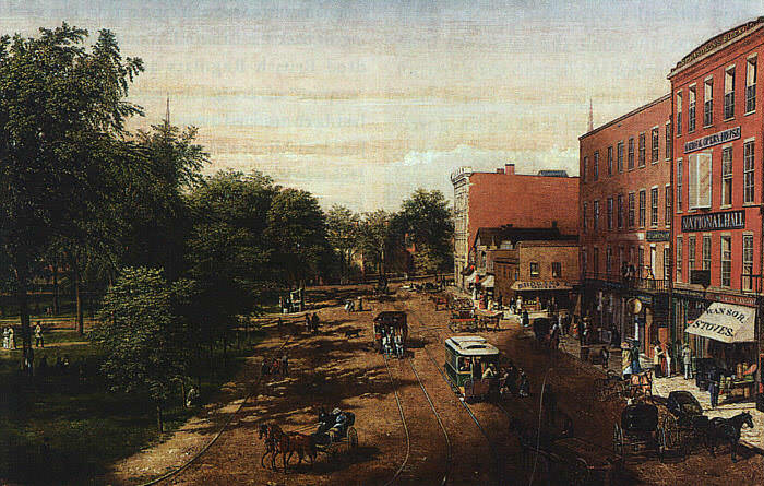 Возможно, это картина, изображающая группу детей, сидящих за столом в комнате с лестницей на стене и мужчиной, стоящим рядом со столом.
