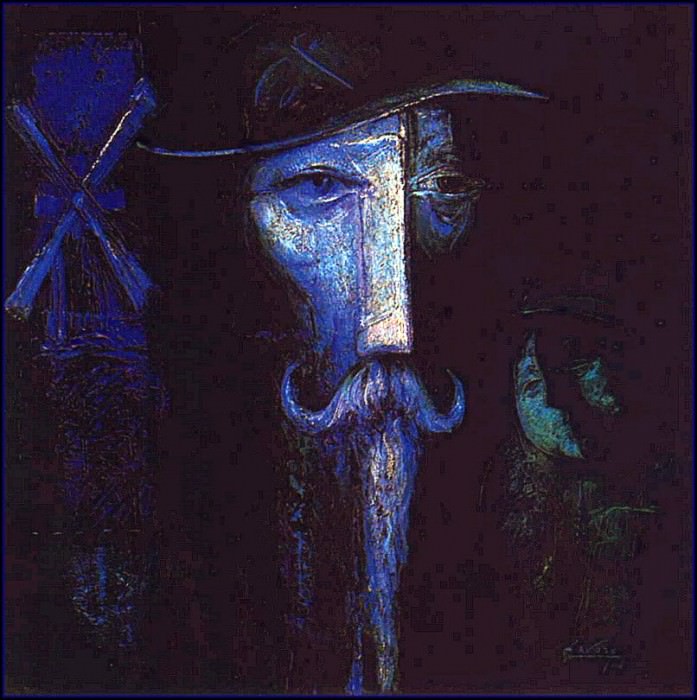 Цветовая гамма картины играет важную роль в создании настроения. Преобладание синего цвета в центральной фигуре символизирует меланхолию, грусть и духовную глубину. Тёплые оттенки красного и оранжевого на заднем плане создают ощущение интенсивности и драматизма.