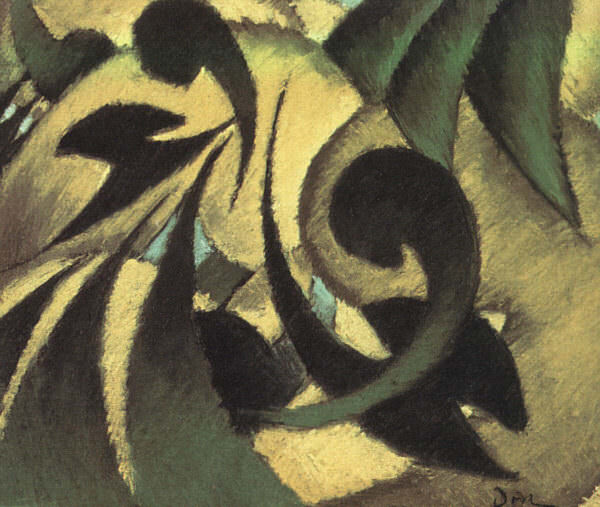 Возможно, это крупный план картины с деревом на переднем плане и голубой вазой в центре картины с правой стороны.