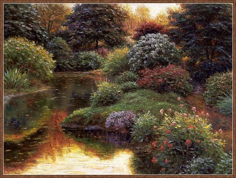 Возможно, это картина с изображением реки, протекающей через пышный зеленый лес рядом с.
