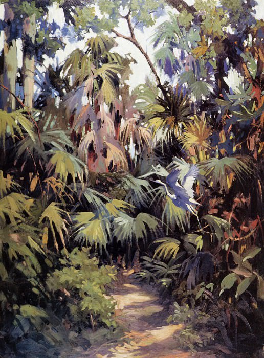 Возможно, это картина, изображающая стол и стулья на балконе с видом на водоем и город вдали с цветами на переднем плане.