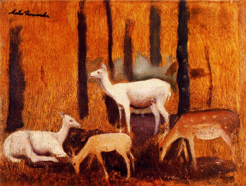 Возможно, это картина, на которой изображена белая собака, лежащая на земле перед деревом с оранжевыми листьями и желто-красными листьями на ветвях.