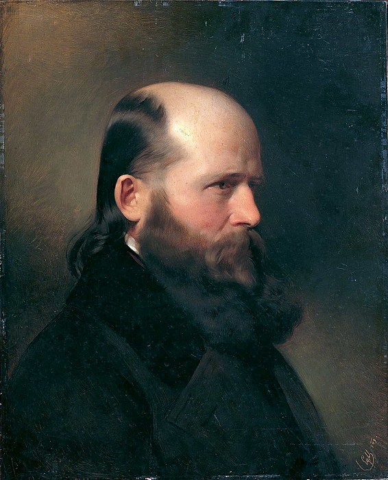 На картине представлен эпизод из жизни бедняков в горной местности. В центре композиции – пожилой мужчина с густой бородой и мальчик, стоящий рядом с ним. Мужчина сидит на скале или каменном выступе, его поза выражает усталость и смирение. Он одет в лохмотья, а на шее повязан оранжевый платок, который выделяется на фоне тёмной одежды. Мальчик стоит рядом, сжимая руки перед собой, что может указывать на тревогу или неловкость. Их одежда также изношена и грязная, подчёркивая их бедственное положение.