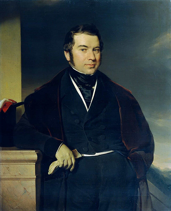 На полотне представлен портрет мужчины, запечатлённого в полуоборота к зрителю. Он сидит на стуле с обивкой насыщенного синего цвета, который контрастирует с белой рубашкой и брюками, виднеющимися из-под сюртука. Мужчина одет в тёмный военный мундир, украшенный золотой парчовой отделкой на воротнике и рукавах. На груди заметны декоративные эполеты, а на поясе – оружие, предположительно кортик. На правой руке он держит трость с замысловатым навершием, что может указывать на его статус и положение в обществе. Взгляд мужчины направлен прямо на зрителя, выражая уверенность и достоинство. Лицо обрамлено тёмными волосами, аккуратно уложенными назад. Небольшая щетина придаёт образу некоторую строгость и подчёркивает мужественность. Композиция картины выстроена таким образом, чтобы акцентировать внимание на фигуре изображённого. Фон нейтрален, что позволяет сосредоточиться на деталях одежды и выражении лица модели. Освещение мягкое, равномерно распределённое по всему телу, без резких теней. Это создаёт ощущение спокойствия и благородства. В контексте представленного образа можно предположить, что изображённый является представителем высшего сословия или занимал важную должность в государственной структуре. Мундир, оружие и трость служат символами власти и социального статуса. Выражение лица модели говорит о его решительности и ответственности. На мой взгляд, картина создаёт впечатление портрета человека, обладающего высоким положением и авторитетом.