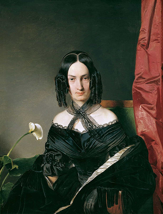 На картине изображена женщина, сидящая в кресле. Её поза демонстрирует сдержанность и достоинство: она слегка наклонена вперёд, руки покоятся на подлокотниках кресла, взгляд направлен прямо на зрителя. Лицо женщины характеризуется выразительными чертами – высокий лоб, прямой нос, тонкие губы. Выражение лица сложное: в нем сочетаются спокойствие и некоторая задумчивость, возможно, даже лёгкая печаль.