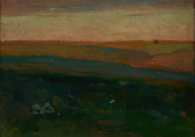 На картине представлен пейзаж, выполненный в тёмной, сдержанной палитре. В центре композиции – поле, простирающееся вдаль до линии горизонта. Поле покрыто буйной растительностью: травянистые кочки перемежаются с цветами и колосками пшеницы, создавая ощущение изобилия и жизненной силы. Справа от зрителя выделяется группа высоких стеблей, словно приглашающая нас углубиться в пространство картины.