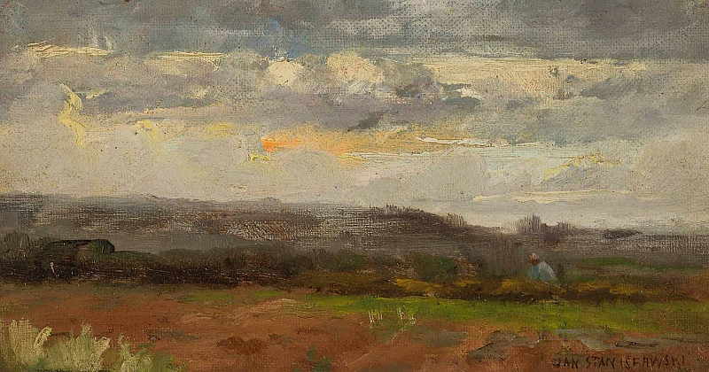 На представленной картине автор изобразил пейзаж, пронизанный ощущением меланхолии и умиротворения. В центре композиции – горизонт, разделяющий небо и землю. Небо занимает значительную часть полотна и написано широкими, энергичными мазками в приглушённых тонах: преобладают оттенки синего, серого и розового. Облака, написанные пастозно, создают впечатление тяжёлой, влажной атмосферы.