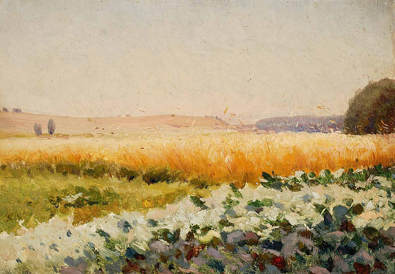 На картине представлен пейзаж – просторное поле, простирающееся до линии горизонта. В переднем плане видны густые заросли высокой травы и колосьев пшеницы, написанные широкими мазками охристых и коричневых тонов. Они создают ощущение плотности и фактурности, передавая текстуру зрелого урожая.