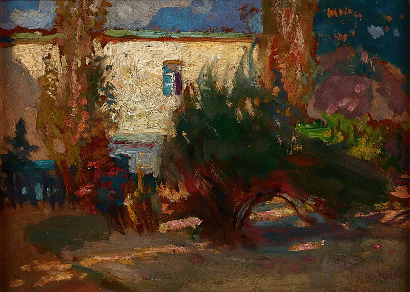Цветовая палитра картины выдержана в приглушённых тонах – преобладают оттенки зелёного, коричневого, серого и охры. Яркий красный цвет мальв выделяется на фоне более спокойной гаммы, привлекая внимание зрителя. Манера письма характеризуется свободной, импрессионистической техникой: мазки широкие, фактурные, создающие ощущение движения и вибрации воздуха.
