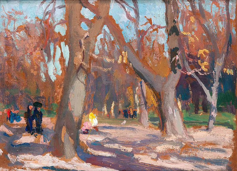 Небо занимает верхнюю часть картины и заполнено тяжёлыми, свинцовыми облаками. Их серая гамма усиливает ощущение подавленности и меланхолии. Сквозь облака пробиваются редкие лучи света, которые отражаются в воде, создавая игру бликов.