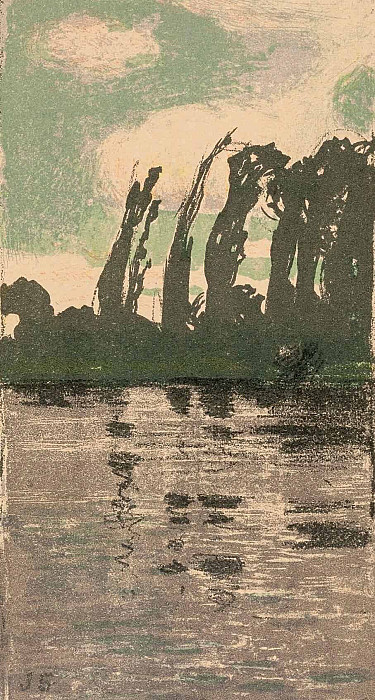 На среднем плане виднеются стволы деревьев и кустарников, написанные более тёмными тонами, что создаёт ощущение глубины пространства. Они кажутся плотными и непроходимыми, формируя визуальный барьер между зрителем и дальней частью пейзажа.