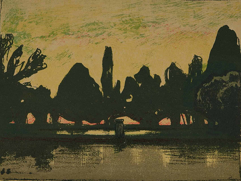 На картине представлен пейзаж, занимающий большую часть пространства. В центре внимания – горный массив, возвышающийся над равниной. Горы изображены в перспективе, что создаёт ощущение глубины и простора. Их силуэты кажутся мощными и величественными, а оттенки серого и синего передают их холодность и неприступность.