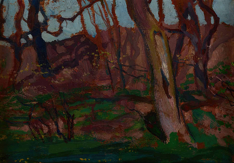 Справа от центральной части пейзажа расположена массивная тёмная группа деревьев, написанная энергичными мазками, что создаёт текстурную поверхность и добавляет динамики в композицию. Деревья служат своеобразным визуальным якорем, уравновешивающим светлую луговую часть.