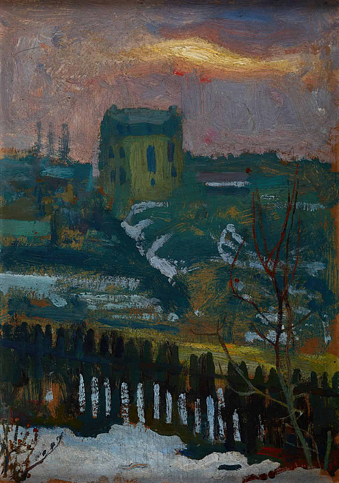 На картине представлен пейзаж с доминирующим элементом – строением, расположенным среди густой растительности. Здание, вероятно, жилой дом, выделяется светлыми стенами и тёмными оконными проёмами. Его архитектура проста, без излишних декоративных деталей, что придаёт ему ощущение уединённости и сдержанности.